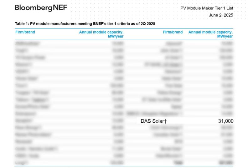 近日,彭博新能源财经(以下简称“BNEF”)公布了2025年第二季度全球光伏组件制造供应商名单,一道新能凭借行业领先的N型技术、稳健的全球化步伐以及优异的品牌口碑等硬核实力,再度蝉联入选BNEF Tier1榜单,位列全球光伏组件一级供应商名录。