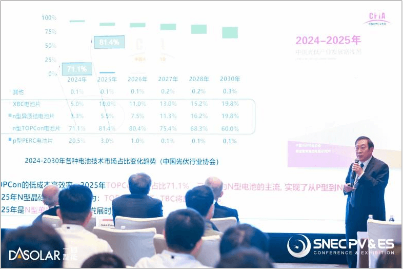 近年来,全球能源结构加速转型,光伏技术的迭代和升级成为了推动新能源行业快速发展的核心驱动力。根据中国光伏行业协会发布的《2024-2025年中国光伏产业发展路线图》数据显示,2024年TOPCon电池的市场占比已达到71.1%,成为行业主流产品,光伏市场也实现了从P型到N型的最快技术迭代,预测2025年TOPCon市场占比将攀升至81.4%,预计到2030年TOPCon市场占比为60%,充分展现了TOPCon技术具有长生命周期属性。