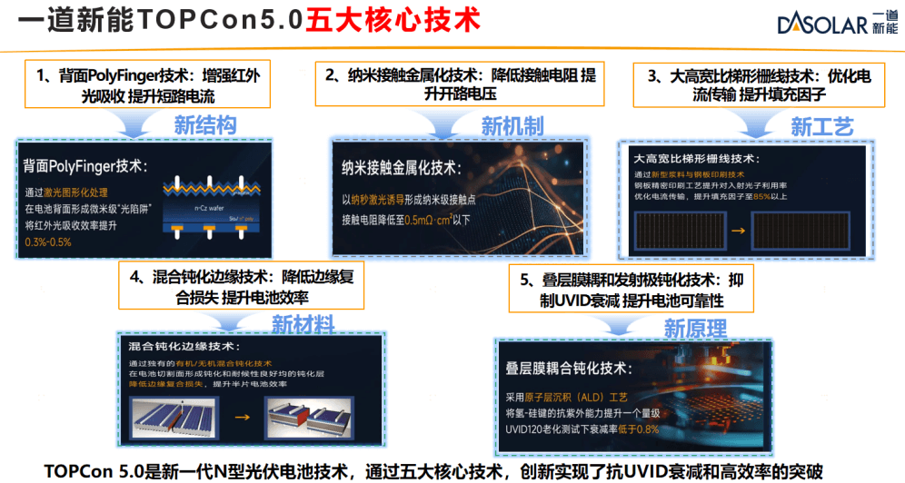 一道新能凭借前瞻性的战略布局与持续创新能力,自成立之初就坚持以TOPCon技术为核心,实现从工艺到产品的全方位突破,引领N型光伏技术迈向新高度。通过在TOPCon技术领域的深耕淬炼,目前一道新能已完成从TOPCon 1.0到TOPCon 5.0的技术迭代。宋博士表示,公司最新一代的TOPCon 5.0技术,聚焦于新结构、新机制、新工艺、新材料、新原理五大核心领域的创新,电池量产效率达27%,开路电压达到746mV,具备高效率低成本的产品优势,持续引领着光伏行业技术的进步和发展。