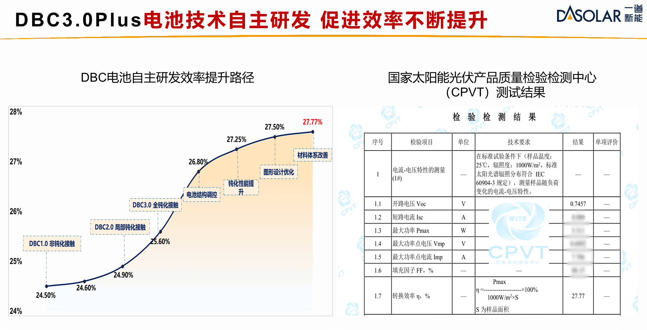 章康平先生在报告中指出,近期“国家太阳能光伏产品质量检验检测中心(CPVT)”测试报告表明,一道新能DBC电池效率达到了27.77%,开路电压提高至745.7mV,这一成果是一道新能自2020年开始,创新性地将其先进的SiO₂/Poly-Si钝化接触结构迁移至电池背面,使TOPCon与BC结构结合,由此创立了拥有完全自主知识产权的DBC电池技术。目前,DBC电池技术从1.0迭代到3.0 Plus,效率从24.5%提升到27.77%,为光伏产业提供多元化的高效解决方案。DBC 3.0 Plus技术依托TOPCon 5.0,采用n型硅衬底,n区与p区均使用SiOx/Poly-Si钝化接触结构,通过自主研发实现了多项关键技术突破,不断提升DBC电池效率。
