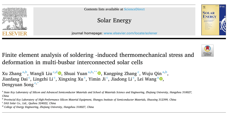 近日,一道新能与浙江大学硅及先进半导体材料全国重点实验室联合攻克薄片化TOPCon卡脖子难题取得突破,研究成果发表在国际太阳能协会(ISES)会刊《Solar Energy》。该研究聚焦薄片化TOPCon电池及组件制备过程中的核心痛点,采用有限元分析方法,构建了包含硅片、栅线、焊带的多材料多维度复合模型,旨在探究硅片厚度、SMBB、焊带数量及焊带横截面形状对焊接诱发热应力与硅片形变的影响。该项联合研究首次系统性揭示了热应力导致的可靠性风险机制并提出解决方案,为N型TOPCon光伏技术规模化降本提质提供了关键技术支撑。