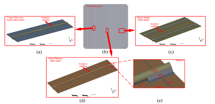 为突破这一难题,一道新能与浙江大学全国重点实验室依托产学研协同创新模式,展开联合攻关。本研究通过开发精细化的有限元分析模型来研究多主栅TOPCon太阳电池焊接过程中的热应力,从而提升太阳电池的可靠性。通过大量仿真与实验验证,深入探究硅片厚度、主栅数量、焊带截面积及形状、焊接温度等关键参数,对焊接诱发应力与硅片变形的影响规律进行了系统研究,建立了适用薄硅片的电池-焊丝-组件联合理论模型。研究发现:应力主要集中在银浆/焊料界面,增加主栅数量能通过强化机械约束减少变形并优化应力分布,扁平焊带在性能上优于圆形、方形和三角形铜线,可最大限度降低应力集中并提升薄电池的机械性能。硅片厚度降低需在硅片材料强度与工艺诱发应力之间实现精细平衡,仿真计算表明,未来N型硅片厚度降低到70微米是可行的。