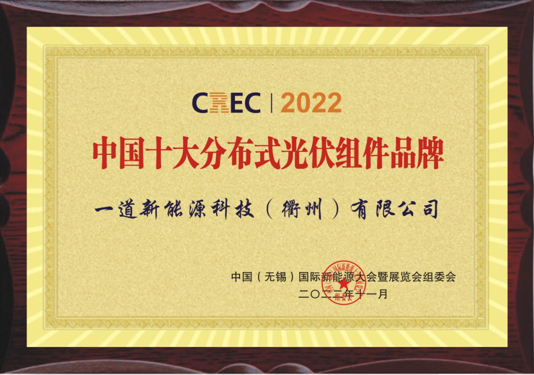 今日,由中国国际商会、江苏省贸促会、无锡市人民政府联合主办“第十四届中国国际新能源大会暨展览会”(以下简称CREC2022)在无锡隆重召开。一道新能凭借领先的技术优势和高可靠性光伏产品,荣获“中国十大分布式光伏组件品牌”奖项,成为全场焦点。