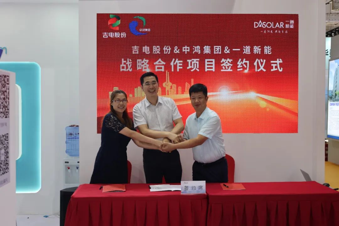 只有团结协作,才能共赢发展。以此次展会为纽带,一道新能与众多合作伙伴沟通洽谈、合作签约,不断深化战略伙伴关系,推动共赢之路越走越宽。展会现场,吉林电力股份有限公司、山东中鸿新能源科技有限公司、一道新能源科技(衢州)有限公司三方齐聚,进行了隆重的签约仪式。山东吉电新能源有限公司总经理王吏、山东中鸿新能源科技有限公司副总经理徐爱珍、一道新能董事长特别助理王春华分别代表三方进行了现场签约。