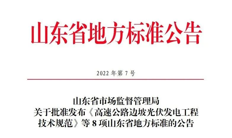 近日,由山东高速集团主导,一道新能源科技(衢州)有限公司(简称“一道新能”)参与编著并提供实验项目支持的山东省地方标准:《高速公路边坡光伏发电工程技术规范》(DB37/T 4516-2022),经山东省市场监督管理局批准正式发布。作为一项重要的地方标准,《高速公路边坡光伏发电工程技术规范》的发布,填补了国内高速公路边坡光伏行业空白,对高速公路边坡光伏发电工程基本规定、项目选址、技术要求、施工交通组织、监控测量、环境保护与水土保持等进行了规范。适用于既有高速公路边坡光伏发电工程建设。新建、改扩建高速公路参照执行。随着《高速公路边坡光伏发电工程技术规范》的正式发布,将有利于推动国内高速公路边坡光伏工程的规模化建设,加快交通基础设施网与运输服务网、信息网、能源网的融合发展,助推新能源产业的发展。据估算,仅山东省内高速公路边坡光伏最大建设容量就高达2.6GW,年均可发电28.6亿度。