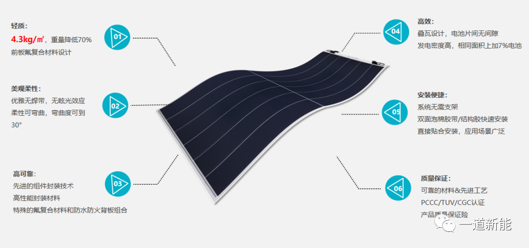 该款产品荣获2021年浙江省工业新产品,经专家认定工艺技术达到国际先进水平,产品采用经UV改性的含氟复合材料、铝箔为封装材料,增强了UV截止性能,改善了产品的柔韧性,能应用于曲面安装;优化了叠瓦技术,减少了电池片留白间隙,提高了发电密度;采用无压块导轨安装,产品具有重量轻、装拆方便等特点。