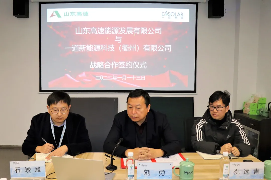 2022年1月13日,山东高速能源发展有限公司(以下简称“山东高速能源”)与一道新能源科技(衢州)有限公司(以下简称“一道新能”)正式签署战略合作协议。山东高速能源党总支书记、董事长丁爱辉,一道新能董事长刘勇等领导出席了签约仪式。