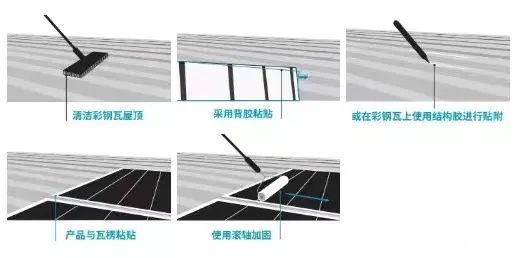 项目安装轻质组件创新采用胶带或结构胶快速粘贴的安装方式,无需支架,免打孔,免加固,不破坏屋面,杜绝打孔安装导致的孔洞年久锈蚀威胁;安装简单快捷,非专业安装工人,只需经过培训即可操作,极大缩短安装时间,节省人力成本。