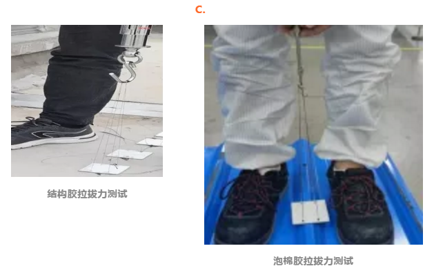 轻质组件安装用结构胶/泡棉胶的拉拔力远远高于实际气候环境需要,拉拔力测试合格