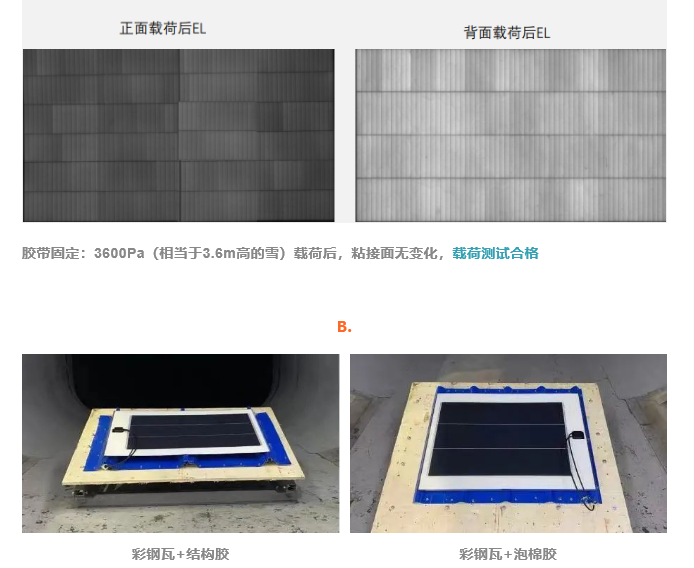对于这种新型安装方式,客户最常提出的疑问是:组件用粘贴的方式安装牢固可靠吗?接下来,我们将用测试数据攻破质疑,证实胶粘安装的组件在各种复杂环境和极端天气下,仍能保持完好无损,发电性能良好。