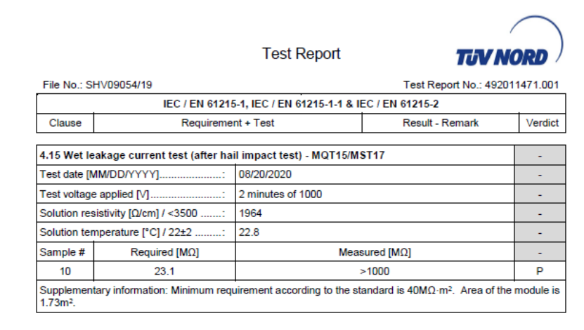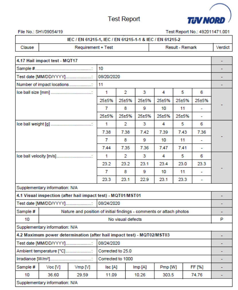 IEC 61215-2-2016 冰雹试验(MQT 17)测试,用直径25mm的冰球(相当于普通鸡蛋的中心直径大小),以23.0m/s的速度冲击试验组件表面的不同位置。冰雹测试对组件验证非常全面,射击点包括组件窗口拐角、组件窗口上、组件边缘、独立电池片、电池片连接线和主焊带以及任何像接线盒上格外容易受冰雹冲击损坏的点。试验结果显示,轻质化组件无外观缺陷以及湿漏电,功率衰减2.35%,远小于IEC测试结果要求的5%,说明轻质化组件抵御冰雹、大风等极端天气的优秀能力。