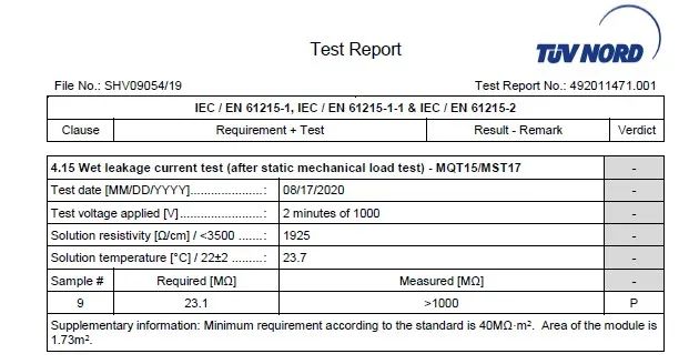 “当组件经受风、雪或覆盖冰等情况时,需要验证光伏组件承受的载荷能力”。为验证一道新能轻质组件抵御外界机械应力的能力,进行了静态载荷测试模拟户外积雪下的组件承受能力。根据IEC 61215-2中MQT 16/MST 34 机械载荷试验流程,在光伏组件前表面和背表面上,逐步将负荷加到2400Pa,使其均匀分布。保持负荷1小时,测试完毕后,检查试验过程中有无间歇断路现象,是否有严重外观缺陷,对其进行标准测试条件下的最大输出功率试验和绝缘电阻试验。机械载荷测试要求组件功率衰减不超过5%,一道新能轻质组件在接受2400Pa载荷试验后,功率衰减小于1.7%,无严重外观缺陷,湿漏电满足测试要求。2400Pa相当于2米左右的积雪产生的压力,充分证明一道新能轻质组件具备卓越的抗雪载荷能力,组件产品可应用在多降雪地区。