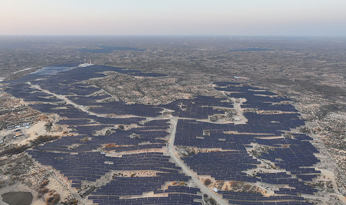 在沙漠、戈壁、荒漠地区开发建设大型风光电基地,光伏电站的外围用草方格沙障和固沙林组成防护林体系,光伏板下安装节水滴灌设施,光伏阵列可根据作物光照需求调节角度,降低极端天气对系统的影响,种植绿色经济作物,实现经济效益和生态效益的共赢。