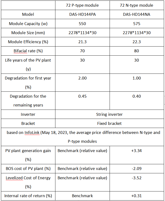Based on the data calculation showing a 3.34% higher wattage per unit for N-type modules compared to P-type modules, in the same geographic location (Haikou, Hainan, Class II light resource area) for constructing PV plants. Assuming that the PV plant systems adopt the same design logic and have consistent DC capacity (100MW on the DC side), the profitability data calculation is based on InfoLink (May 18, 2023, the average price difference between N-type and P-type modules) shown below.