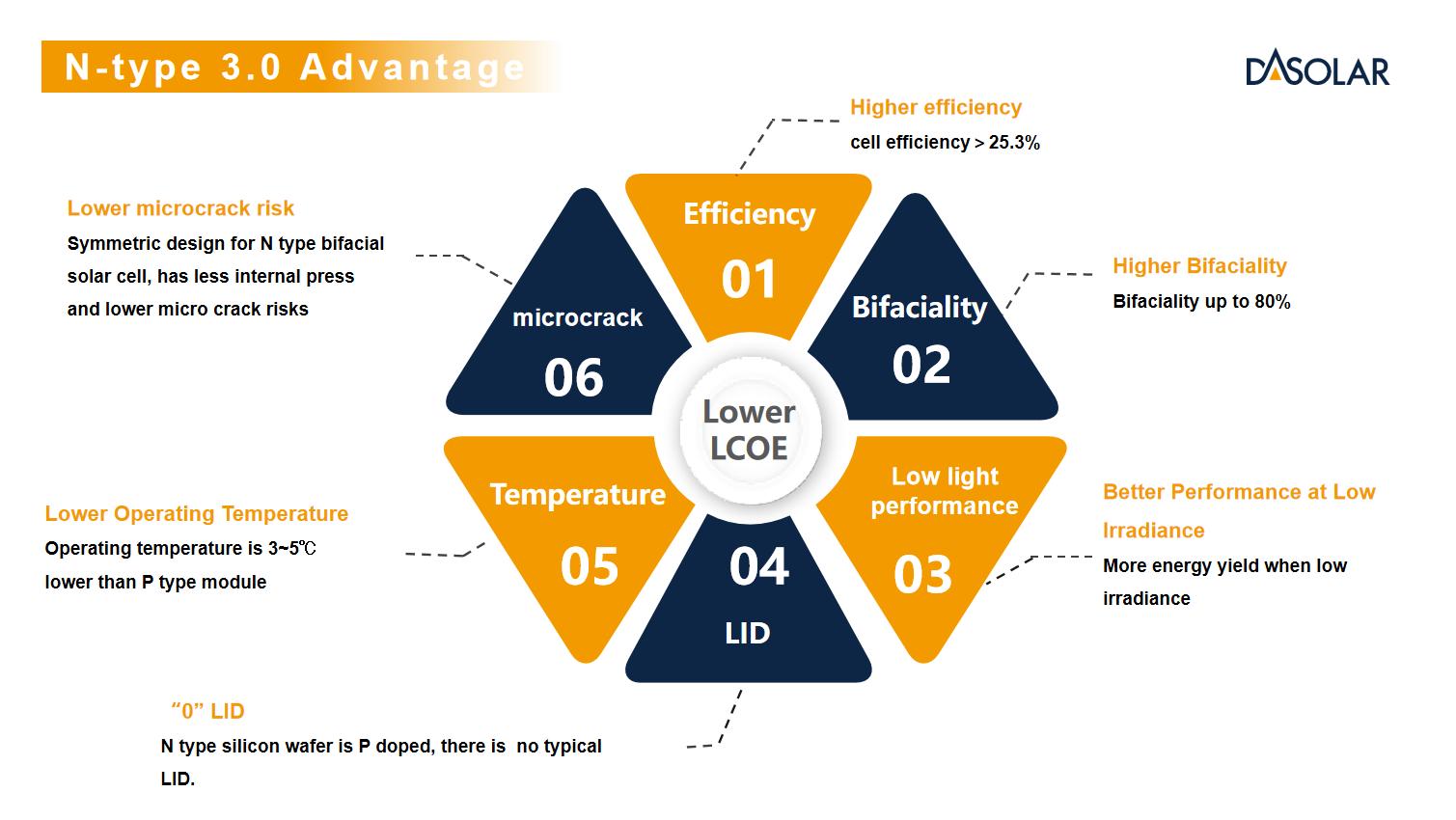 Based on comparative data from string and power design installations, N-type modules outperform P-type modules in power generation. These results contribute to a reduction in the Levelized Cost of Electricity (LCOE) while delivering higher energy output. DAS Solar's modules are versatile and suitable for various projects, including large-scale utility PV plants, commercial and industrial distributed systems, and residential photovoltaic. Additionally, they encompass full scenarios, including desert, urban, and offshore photovoltaics.