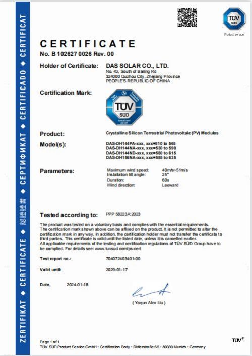 DAS Solar PV products have first successfully awarded for wind tunnel certification by TÜV SÜD