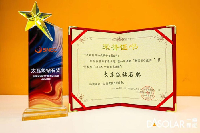 闪耀收官|一道新能DBC组件获颁SNEC十大亮点评选“太瓦级钻石”奖