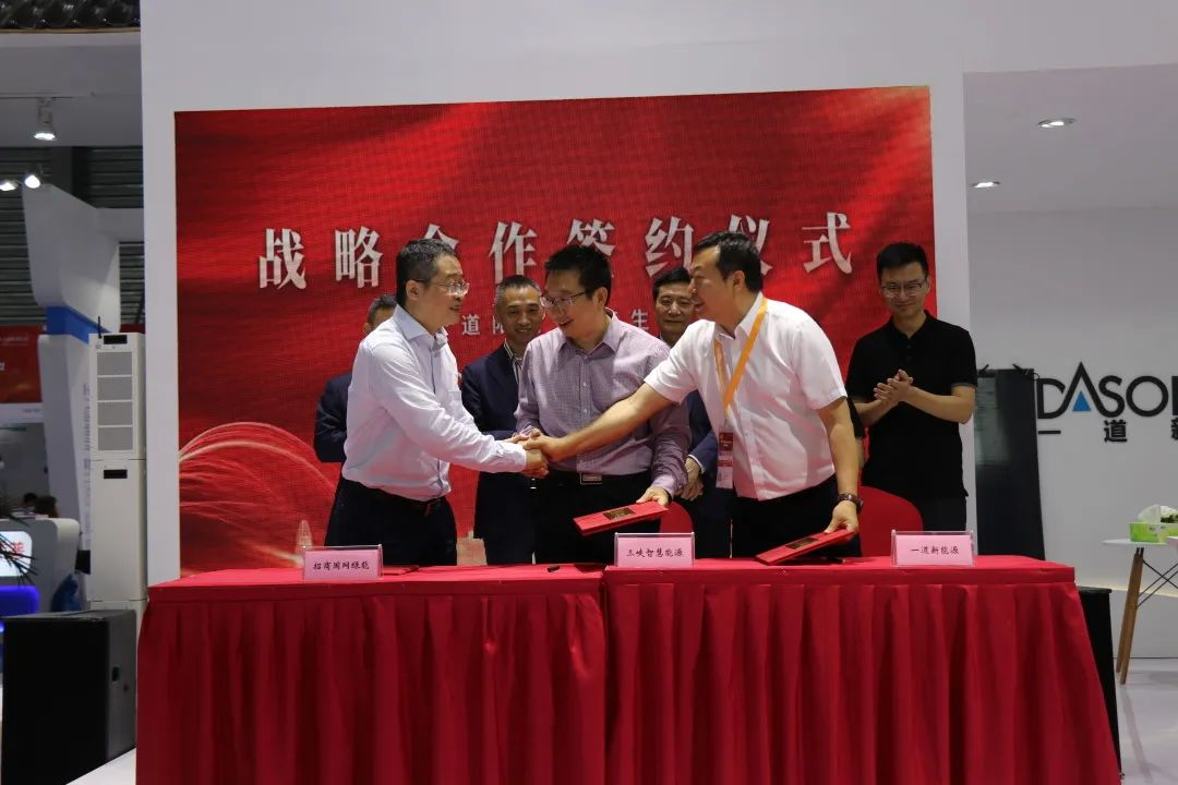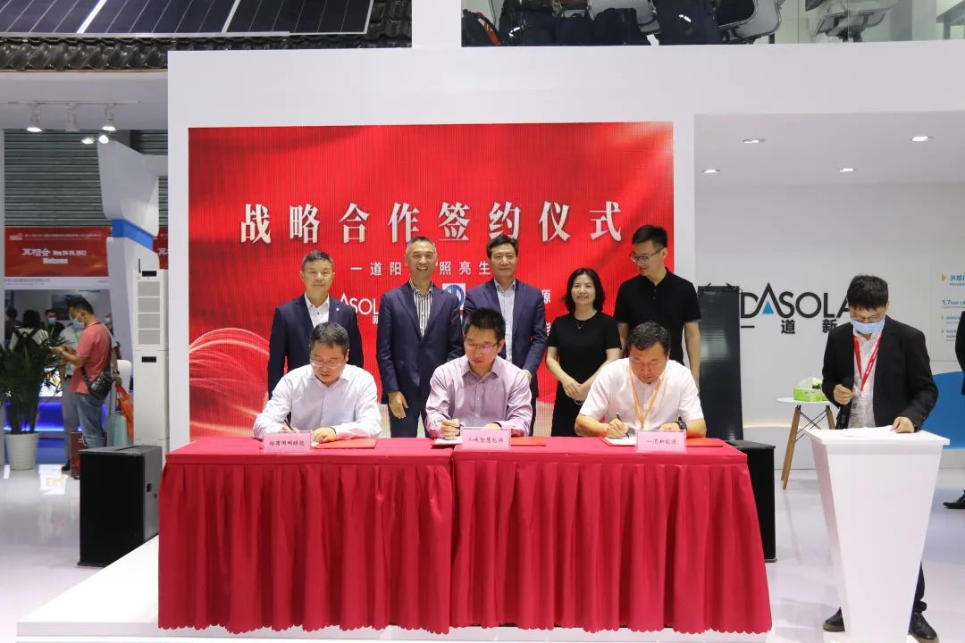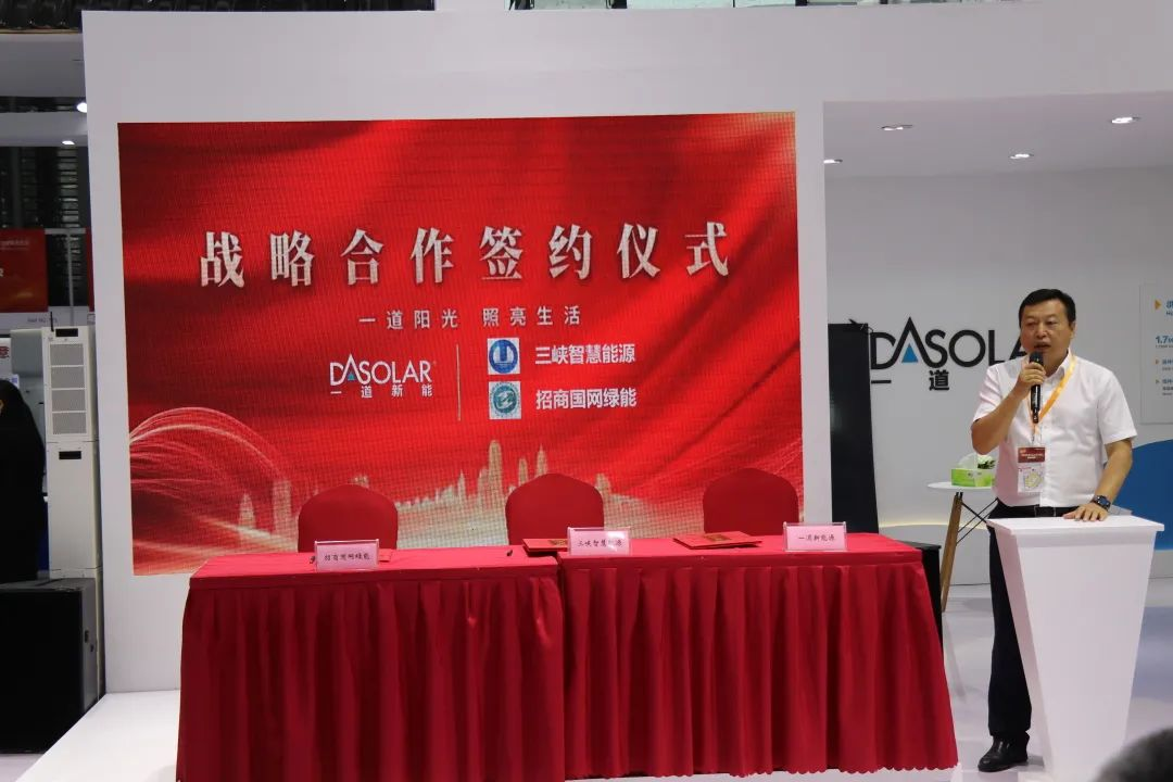 当天上午一道新能源科技(衢州)有限公司(简称“一道新能”)与招商国网绿色能源科技有限责任公司(简称“招商国网”)和三峡智慧能源投资(海南)有限公司(简称“三峡智慧能源”)在一道新能展台N2-370举行战略合作伙伴签约仪式。一道新能董事长刘勇先生、招商国网总经理祝国胜先生、三峡智慧能源总经理刘安家先生作为签约人出席本次活动,招商局创新投资总经理吕克俭先生、招商国网董事长吴新华先生、 三峡资本董事长金才玖先生、三峡鑫泰总经理许汉明先生、一道新能董事施思女士见证了三方战略合作签约。