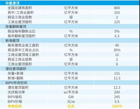 在补贴政策的助力支持下,相较于传统光伏屋顶,BIPV拥有更广阔的市场方向和更高的经济价值:仅考虑工商业,我国每年潜在屋顶面积12.3亿平方米,市场空间1.3万亿。
