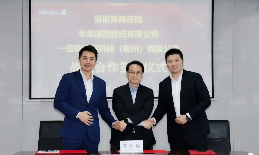 2023年2月20日,一道新能宣布与慕尼黑再保险绿能风险团队(以下简称“慕再”)、韦莱保险经纪签署2023年度光伏组件质量保证保单再保协议,为全球客户提供全方位的组件质量以及效能双重保障服务。一道新能高级营销副总裁曹晓荣,慕再绿色科技解决方案副总监Kollsman Chan,韦莱保险经纪董事、新能源负责人吕宇翔等相关领导出席签约仪式。