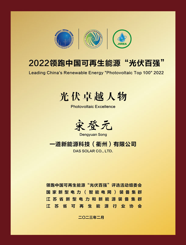 2023年2月24日,第十届中国(江苏)国际新型光伏创新发展大会暨领跑中国可再生能源“光伏百强”颁奖典礼在南京举行,一道新能研发中心总监何春涛受邀作《大(中)跨距柔性支架技术与多场景应用》主题演讲。凭借在光伏行业N型领域的领跑者优势,一道新能荣获2022领跑中国可再生能源“光伏百强”优秀光伏电池/组件企业,CTO宋登元博士获颁“光伏卓越人物”称号。