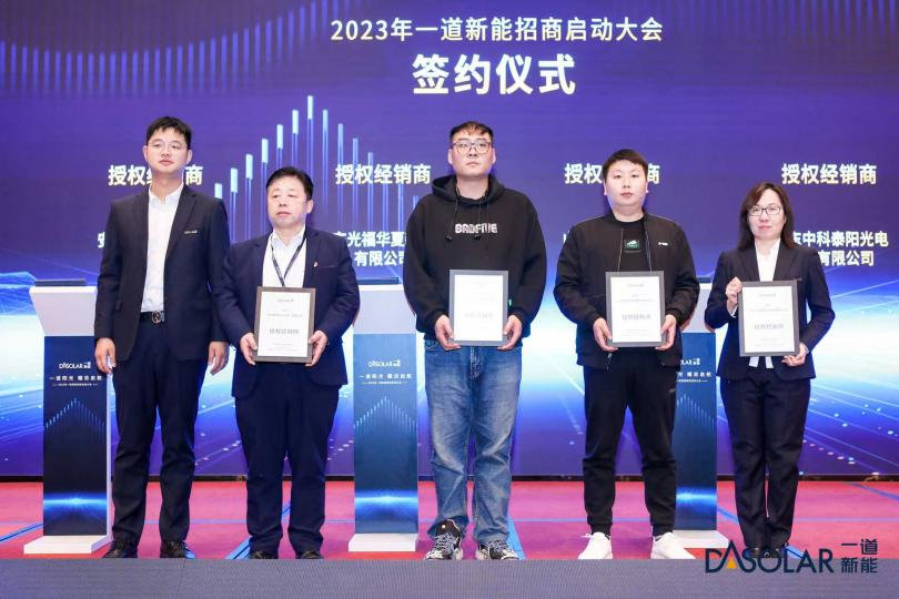 一道新能分布式销售总监鞠航从导入流程、等级体系、资质要求等方面详细解读了经销商制度,他表示公司在经销商推广政策上给予了多重红利,根据经销商资质、等级给予不同的授权,享受相应优质权益,并将通过培训及客户资源管理全面赋能经销商。在随后进行的战略合作伙伴、经销商签约仪式上,现场气氛十分火爆。未来,一道新能会携手合作伙伴,助力中国分布式光伏的新发展。