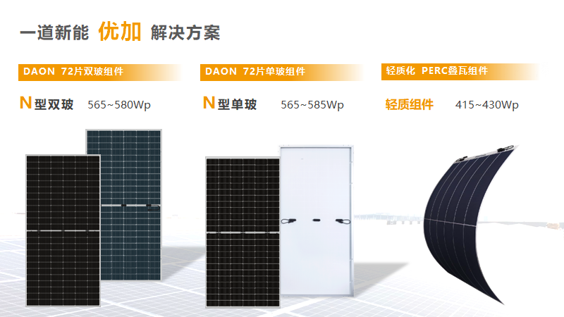 根据国家能源局数据显示,2022年我国光伏新增装机87.41GW,其中分布式光伏新增装机量达到51.1GW,连续两年占比超过50%,已成为光伏市场增量的重要突破口。作为一种新型发电及能源的综合利用方式,分布式光伏所具备的小规模、分散性、就地发电等属性决定了其拥有灵活多样的应用形式及丰富多元的应用场景。在当前整县推进政策下,工商业分布式建筑和户用分布式建筑仍然是推动分布式市场发展的主要力量,一道新能凝结多年深耕分布式领域经验,基于不同建筑类型的安装诉求,量身定制三款高效产品解决方案。DAON 72片单玻组件适用常规户用屋顶,兼具大尺寸和高颜值,高安装容量及高转换效率为用户带来更高的发电效益;DAON 72片双玻组件适用学校、政府、医院等搭建的可承重水泥屋顶,白色涂料处理屋面增加屋面反射率,再搭配安装DAON双玻组件,可有效提升单位屋顶面积的光伏系统发电量;重量仅为4.3kg/m²的轻质组件更能满足承重不足屋顶的安装需求,集高效、轻便、美观于一体,完美解决荷载痛点。