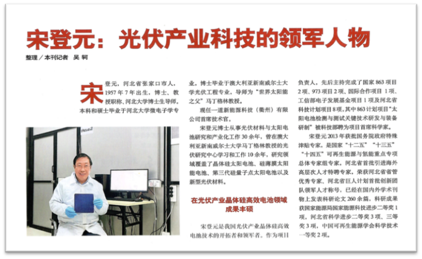 近日,中宣部、国家新闻出版总署重点联系的中央级期刊《中华英才》2023年第9-10期刊发了一道新能CTO宋登元博士的专访,介绍了一道新能作为N型光伏技术的领军企业,创立不到5年,通过创新引领创造了一道奇迹:2022年产值达到110.5亿元,相较创立初期的2019年产值增长近百倍;N型组件出货量全球第三,组件出货量位列全球第八;并荣列2023全球光伏品牌榜100强第45名、全球光伏品牌价值(组件)20强第9名、中国光伏组件企业20强第8名的爆发式辉煌成长历程,并以《宋登元:光伏产业科技的领军人物》为题,报道了一道新能研发团队的创新历程。