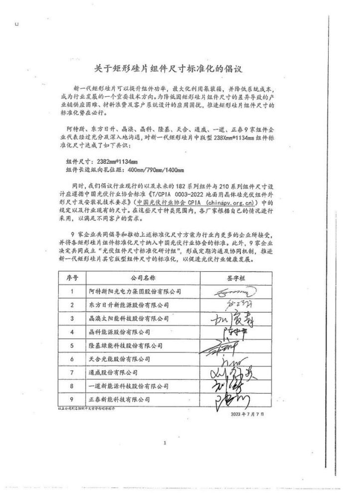 近日,一道新能与多家光伏头部企业共同发起矩形硅片组件尺寸标准化倡议书,经多方深入商讨后,就矩形硅片中版型组件产品标准化尺寸及长边纵向孔位距达成了统一意见。作为新一线光伏品牌,一道新能在降本增效、加速产业链融合的同时,助力光伏生态圈开启新一轮协作共赢模式。