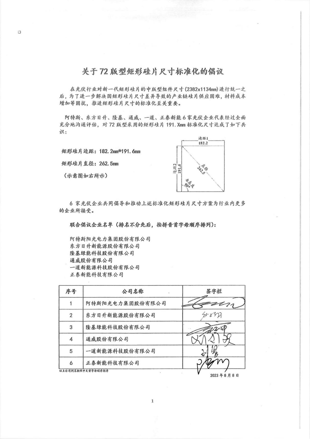 一道、阿特斯、东方日升、隆基、通威、正泰新能6家光伏企业代表经过全面充分地沟通评估,对72版型采用的矩形硅片191.Xmm标准化尺寸达成了如下共识:
