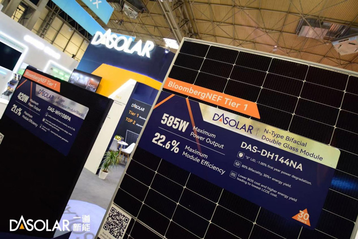 作为N型技术的引领者,一道新能始终坚持N型技术创新与产品升级,构筑双碳未来。本次展会,一道新能携全新DAON系列630W 双面双玻组件、585W双面双玻组件及420W全黑组件等产品亮相。一道新能N型组件具备低隐裂风险、低工作温度、低光致衰减、高转换效率、高双面率、高弱光发电等特点,其中,针对欧洲本土市场所推出的全黑系列组件创造性采用新型镀膜技术结合无色镀膜玻璃,呈现出黑色边框、黑色背板、黑色汇流条的全黑极致美学。