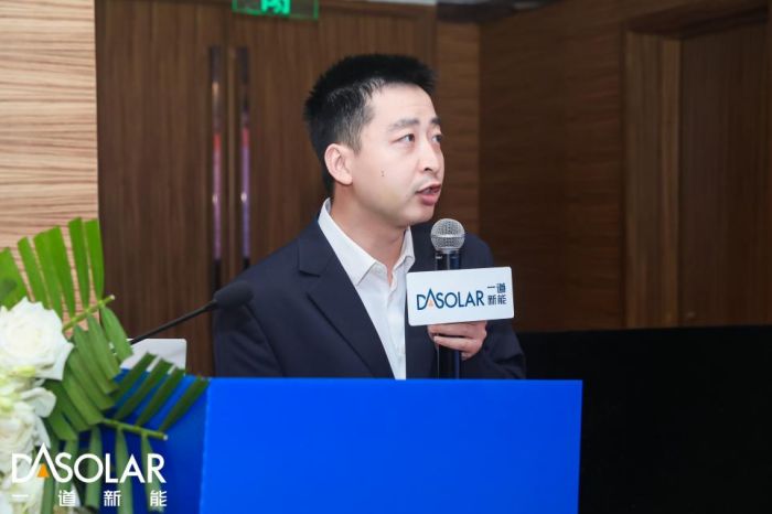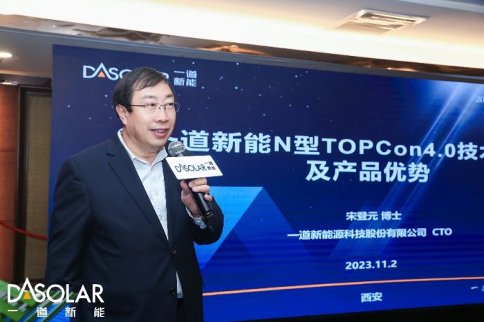 会上,宋登元博士发表题为《一道新能N型TOPCon4.0技术进展及产品优势》的主题演讲,就一道新能创新发展、TOPCon4.0技术“四型”优势、DAON4.0光伏发电优势及18种解决方案、发电增益实证等方面进行了阐述。一道新能从成立之初就坚定选择了N型TOPCon技术,历经TOPCon1.0到TOPCon4.0技术路线的快速迭代,搭载新载流子传输机制、新结构、新Poly-finger等技术的应用和新材料应用的“四新”特征,在追求技术创新之路上不断攀登,转换效率不断刷新纪录,大规模量产效率超过25.9%,TOPCon4.0大面积电池(面积为333.4cm²)效率突破26.33%,打破了5月创造的26.24%效率纪录,创大面积TOPCon电池效率的世界纪录。同时一道新能前瞻性布局了TBC,CSPC,TSiP,SFOS等技术路线,电池效率将超过35%。