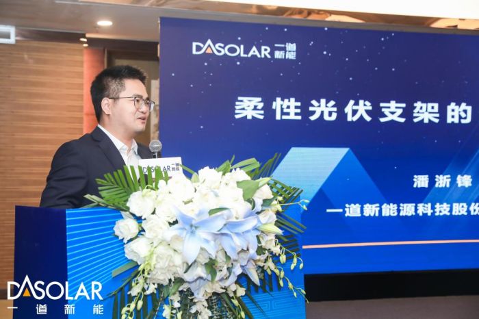 潘浙锋先生发表题为《柔性光伏支架的多场景应用》的专题报告。他表示,一道新能柔性支架采用2根预应力镀锌钢绞线作为组件承重索,在东西向组件平面内通过预应力索体系的相关设计,有效控制拉索弧垂,抵抗外部荷载的作用。南北向排间设置索杆抗风稳定系统,将阵列东西、南北形成空间索网结构,增加组件平面外抗扭刚度及结构的阻尼,有效减低风振对组件的不利影响。一道新能柔性支架具有高效复合用地、安装便捷、高性价比、高可靠性等显著优势。在地势高低起伏的山地环境下,一道新能柔性支架具有灵活布置、占地面积小的特点,已广泛应用于复杂的山地项目,实现土地高效复合利用。在地势平坦的渔光、畜光等项目中,一道新能柔性支架利用高净空、大跨距的特点为板下生产活动提供便利条件,真正实现土地的立体式开发。