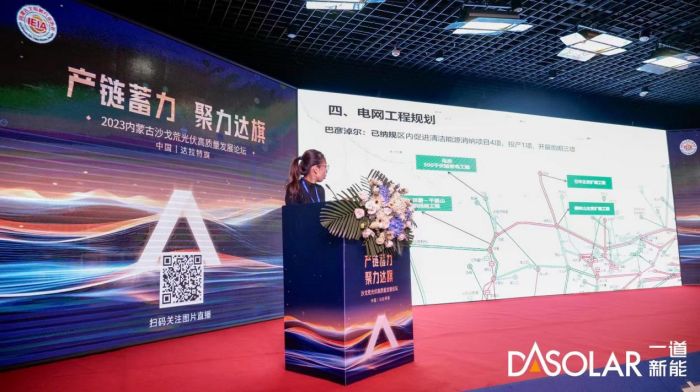 最后,一道新能高级副总裁黄卫红女士代表一道新能做开场致词。黄总表示,随着国家“双碳”目标的持续推进,近年来,内蒙光伏产业蓬勃发展。今年10月,内蒙古汇达一道新能源科技有限公司年产5.5 GW高效组件生产项目在达拉特旗正式投产,汇达一道作为达拉特旗最先进的光伏组件制造企业,填补了达拉特旗在光伏组件制造产业的空白,也开启了达拉特旗新能源产业链集群发展的新局面。未来,依托在沙戈荒项目的丰富经验,一道新能将全面助力内蒙古绿色能源的转型。