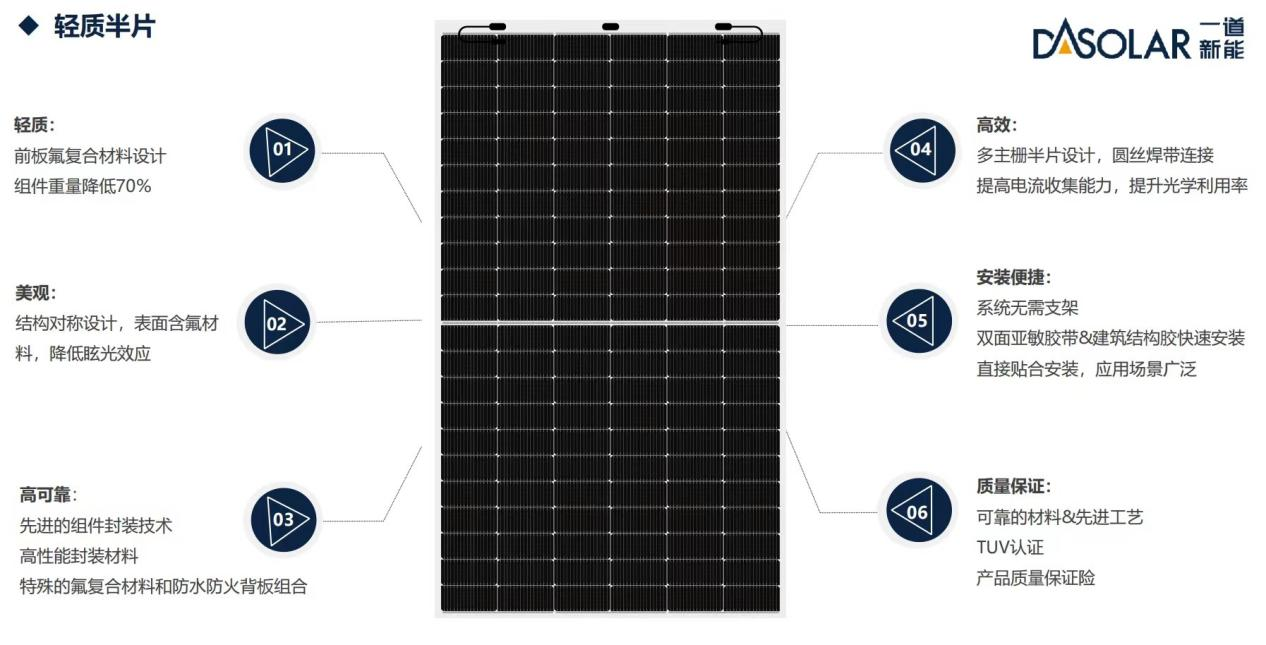 依托行业领先的N型技术优势,一道新能自主研发的N型轻质组件成为光伏多场景应用的又一利器。该组件前板采用氟复合材料设计,重量可降低70%,可实现单人搬运安装,可完美适配有限承重的屋顶等项目环境;表面含氟材料的使用在降低眩光效应的同时兼具美观体验;系统无需支架,双面亚敏胶带&建筑结构胶快速安装,直接贴合安装,适用场景更为广泛。基于严苛的材料准入要求,一道新能N型轻质组件选用POE胶膜,高可靠性POE封装能为客户带来长期稳定的发电量增益价值,从而最大化实现N型产品优势。