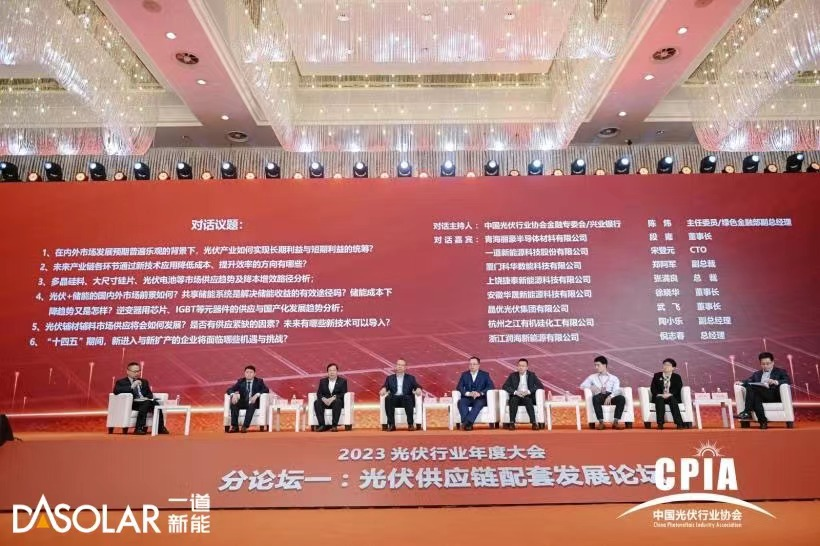 2023年12月14日,中国光伏行业协会主办的2023光伏行业年度大会在江苏宿迁召开,近千名来自行业主管部门、行业组织、行业专家、光伏企业领袖等代表就2023光伏行业发展热点问题进行深入探讨,并对2024年的光伏产业发展进行展望和预判。一道新能CTO宋登元博士受邀参加光伏供应链配套发展论坛并作为嘉宾参与高端对话环节,就产业链各环节降本增效等议题进行阐述。
