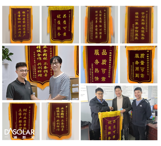 在收获诸多来自客户端好评的同时,一道新能还先后获颁“全国光伏行业质量领先企业”、“全国光伏行业质量领先品牌”、“全国质量检验稳定合格品”、“全国质量诚信标杆企业”等奖项,充分彰显了公司在行业内高品质产品的超能实力。一面面锦旗、一次次荣誉代表着一路走来合作伙伴对一道新能的信任和肯定。展望未来,站在全新的起点,公司将秉承客户价值为先,以高质量管控为目标,以创新引擎为驱动,以行业领先的N型技术为核心,以协同、共赢为价值观,持续践行严苛全流程质量管控体系,助力光伏行业实现高质量发展!