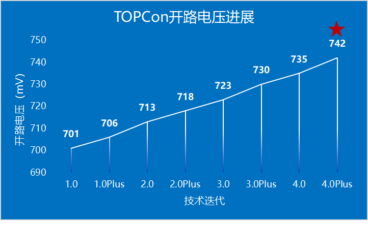 作为N型技术的引领者,一道新能在N型TOPCon技术的研发上,一直秉承创新无止境的理念。一道新能首席技术官宋登元博士表示:“开路电压是太阳电池最核心的技术指标,标志着太阳电池效率提升的潜力。目前一道新能研发团队在TOPCon电池开路电压上持续突破,从TOPCon1.0的701mV到目前的742mV,TOPCon4.0 Plus具有完美的电池钝化结构,支撑了高开路电压的技术优势,未来还有巨大的效率提升潜力,相信在一道新能的努力下,TOPCon技术正在向着其28.7%理论极限迈进”。