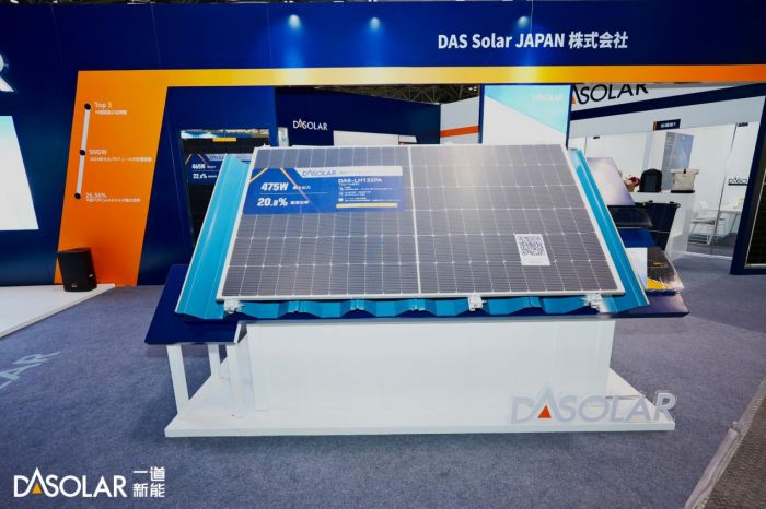 在自然资源相对匮乏的日本,兼具高效率、高功率、高双面率、低光致衰减、高可靠性等特性的N型产品优势更为突显。本次展会一道新能亮相的产品有DAON双面双玻465W矩形全黑组件、DAON双面双玻615W矩形组件,430W轻质叠瓦组件、475W轻质半片组件等高效产品。其中,结合了N型技术、矩形产品尺寸及全黑设计的DAON双面双玻465W矩形全黑组件吸引了众多展台观众的目光。作为N型技术的引领者,一道新能DAON矩形组件搭载了业内最先进的TOPCon 4.0 Plus电池技术,大面积电池(面积为334cm²)效率突破26.36%,开路电压达到742mV,创造了世界纪录。矩形组件以最优的尺寸设计助力着产业链合作开放、协同共赢,在效率、功率、制造、工艺、运输等多方面的革新突显了集约化优势,有效降低系统BOS成本和LCOE,保障长期、稳定、高效的发电收益。全黑设计则体现了典雅大气的外观品性,能卓越适配并完美融合建筑外观,在优雅极致中绽放澎湃绿能。