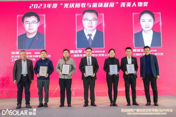 大会进行了2023年度“光伏回收与循环利用”优秀集体和菁英人物颁奖仪式,对获奖者进行了隆重表彰。多年来,一道新能作为N型技术领先的一线光伏企业,大力开展光伏组件回收技术研发,核心装备开发、产业化落地,并最大化实现废旧组件的各组分回收和循环利用。由于在组件回收研发和产业落地方面的突出成绩和贡献,一道新能陈志军总监荣获2023年度“光伏回收与循环利用”菁英人物奖。
