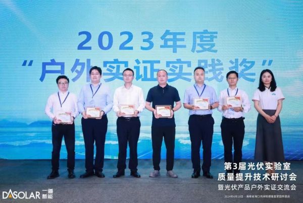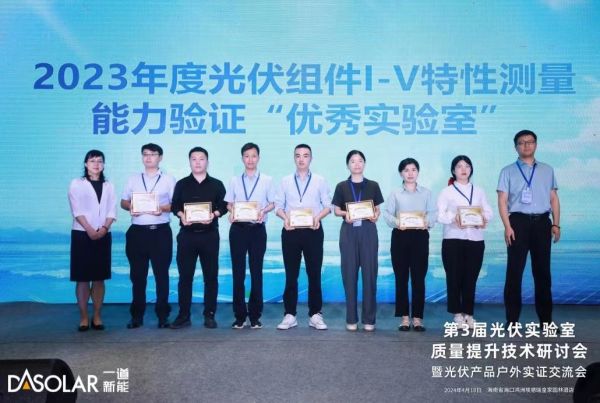 近日,第三届光伏实验室质量提升技术研讨会暨光伏产品户外实证交流会在海口召开。一道新能受邀参会并作智能化光伏实验室主题报告。会议同期,凭借先进的实验室水平和硬核的产品质量,一道新能光伏实验室荣获2023年光伏组件I-V特性测量能力验证“优秀实验室”、2023年光伏企业“户外实证实践奖”两项大奖。