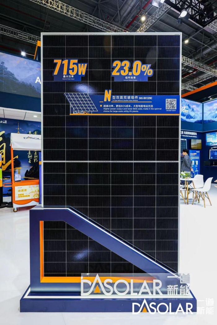 为了满足大型地面电站对高功率700W+组件的需求,一道新能开发推出了210*210 N型组件,该款产品采用了一道新能自主研发的TOPCon 4.0 Plus电池技术,搭配210*210的大硅片设计,组件功率高达715W,以客户价值为中心,在确保高效发电的基础上,可以有效降低大型地面电站的BOS成本,实现更低的LCOE度电成本。