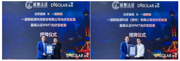 北京鉴衡认证中心是国内权威的第三方技术服务机构,专业从事标准研制、检测、检验、认证、技术评价及行业研究,面向产业链上的所有客户提供定制化综合解决方案等服务。日前,北京鉴衡认证中心对一道新能光伏实验室及一道新能漳州基地光伏实验室进行了全方位、严格审核,评审结果显示,光伏实验室在"人、机、料、法、环、测"上均符合IEC 17025和鉴衡制造商检测实验室管理程序的要求,并在此次展会现场被授予鉴衡认证“WMT光伏实验室”资质。