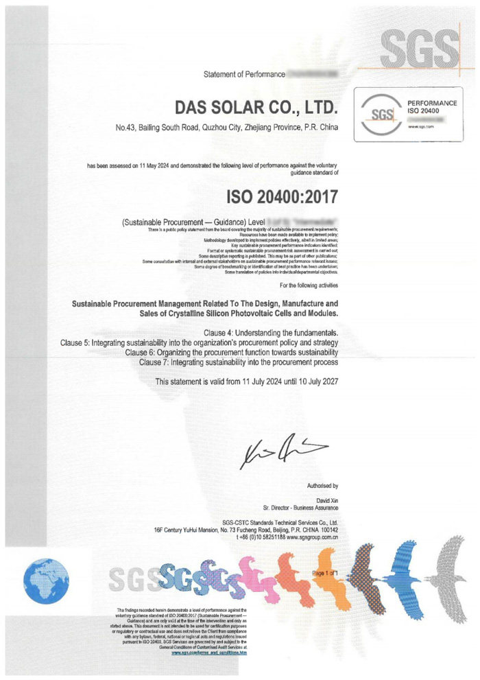 近日,一道新能获得由SGS通标标准技术服务有限公司颁发的ISO 20400可持续采购管理体系证书,成为光伏行业内首个获得可持续采购体系认证的企业,标志着公司已按照ISO 20400的要求率先完成了在环境、社会、经济三大维度上的多项要求,凸显了一道新能在可持续供应链方面的专业能力,同时也是一道新能积极履行社会责任的有力背书。