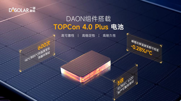 搭载TOPCon 4.0 Plus电池的DAON组件具有高效率、高功率、高双面率、低衰减、高可靠性等硬核优势,严苛的材料选择,先进的技术工艺,加严的可靠性测试,让DAON组件在面对极热、极寒、高湿热等严酷天气挑战时依然表现出强悍的发电性能。未来,在坚守高质量产品标准的同时,一道新能将在高可靠性、高稳定性产品研发领域深耕淬炼,助力客户在全生命周期内实现光伏产品的最优价值!
