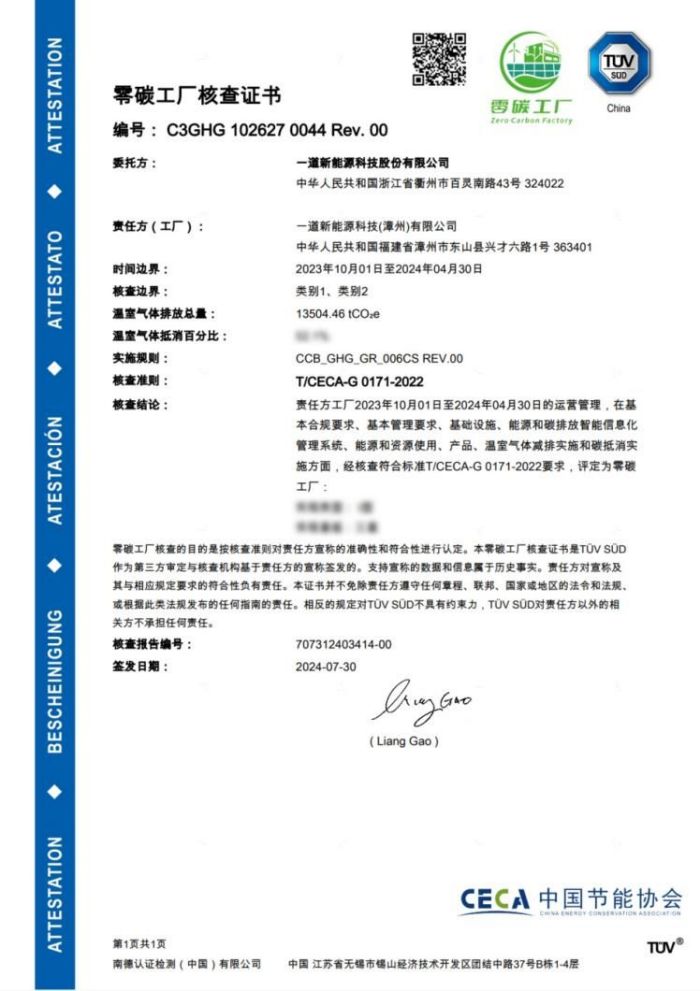 一道新能在产品设计中引入生态设计的理念,优化生产工艺,减少原辅材料的消耗和能源消耗,使用低碳原材料,降低产品全生命周期温室气体的排放。采用ISO14067等适用的标准或规范对产品进行碳足迹核算或核查,通过结果比对进行产品碳足迹改善并获得认证。