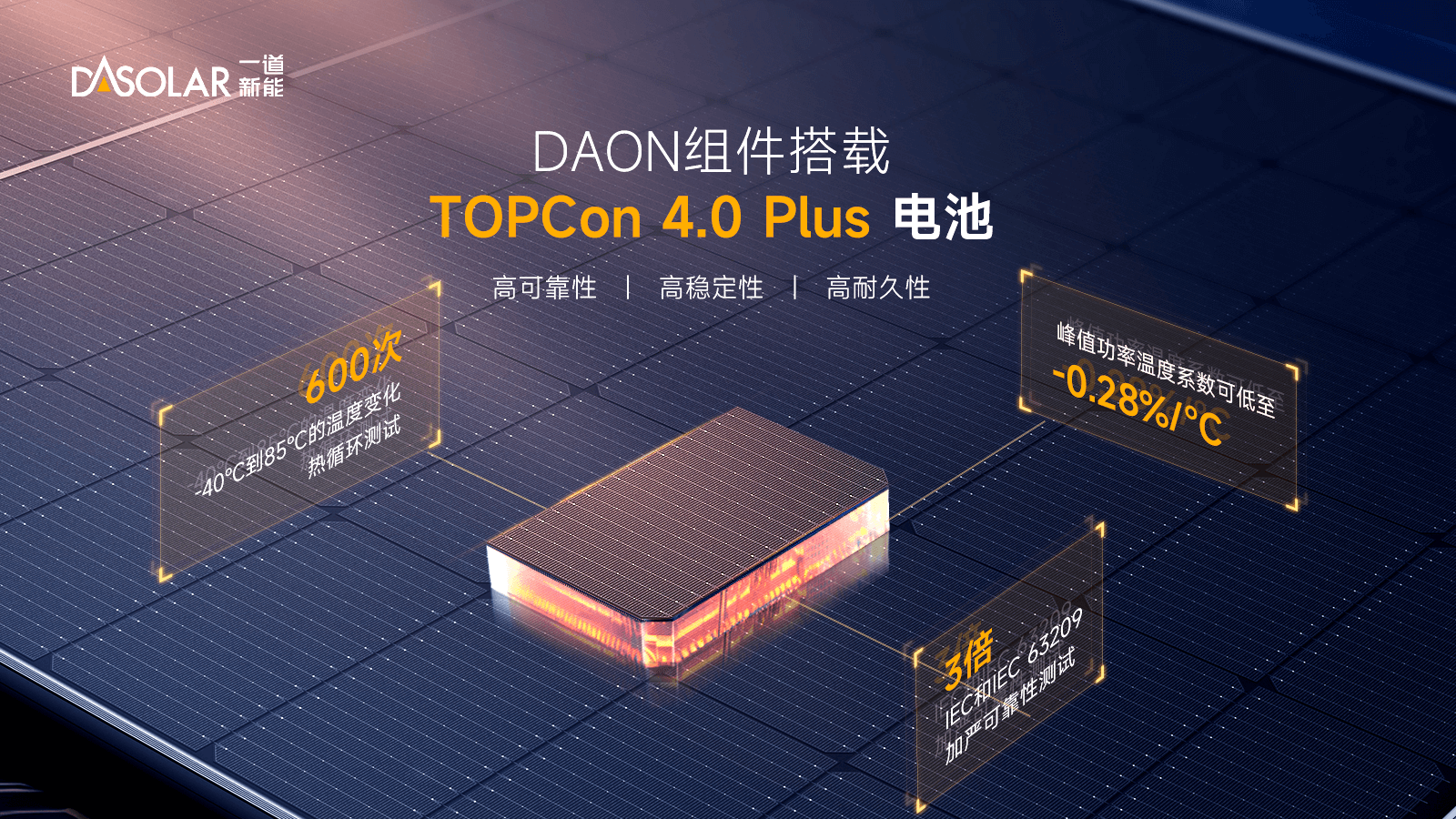 近日,一道新能DAON 4.0组件实现跨越式新突破,搭载TOPCon 4.0 Plus电池的高效光伏组件经过全球权威第三方认证机构TÜV 南德测试认证,组件最高输出功率达到610.15W,全面积组件转换效率达到24.02%,标志着一道新能在N型TOPCon高效电池和组件技术路线上实现了跨越式新突破。