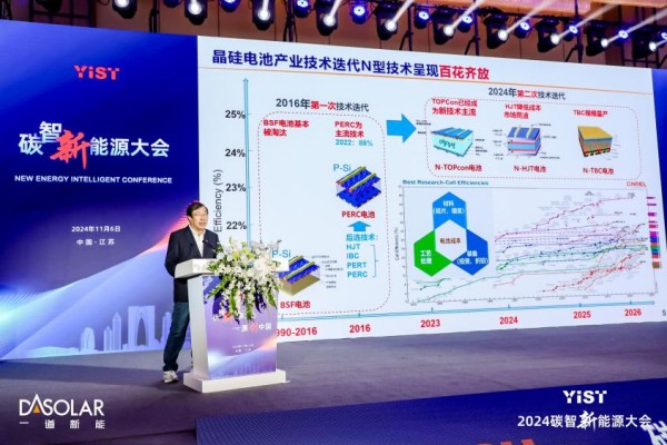 近日,由长三角太阳能光伏技术创新中心主办的碳智新能源大会在苏州召开,来自光伏行业专家、研究院所学者、企业家代表等就我国新能源创新技术及应用的发展,打造健康多元活力的产业集群,推动光伏产业升级等议题展开讨论。一道新能CTO宋登元博士受邀出席并作《晶硅电池技术迭代规律及TOPCon提效方案》主旨演讲。