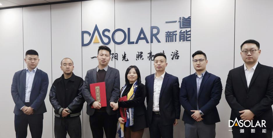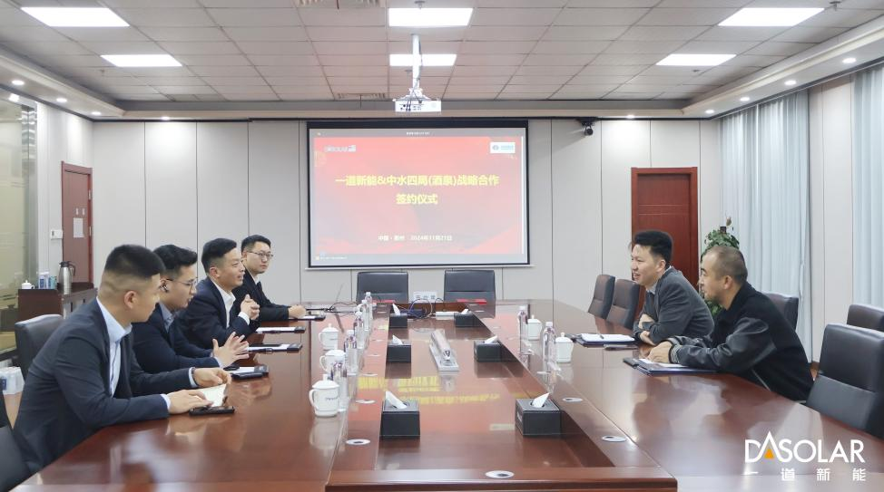 近日,一道新能与中国电建旗下的中国水电四局(酒泉)新能源装备有限公司[以下简称“中水四局(酒泉)”]签署战略框架协议,双方将携手在N型光伏组件与轻质组件配套产品领域展开深度合作,共同构建高效协同的新能源产业链创新模式。中水四局(酒泉)副总经理董润明先生、经营办主任李鹏先生,一道新能营销副总裁刘付炯先生、集团供应链中心总经理周芹女士、北方大区总经理陈英杰先生等出席现场签约仪式。