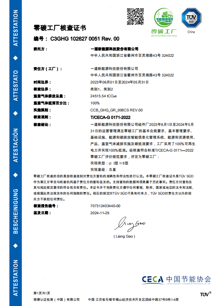 近日,一道新能衢州基地凭借100%可再生能源电力消耗和100%温室气体抵消的优异成绩,获得由TÜV南德颁发的组织碳中和及零碳工厂(I型,5 星)认证双证书。这不仅是对一道新能在低碳管理和绿色制造领域的高度肯定,更标志着一道新能在实现“双碳”目标的道路上迈出了坚实一步。